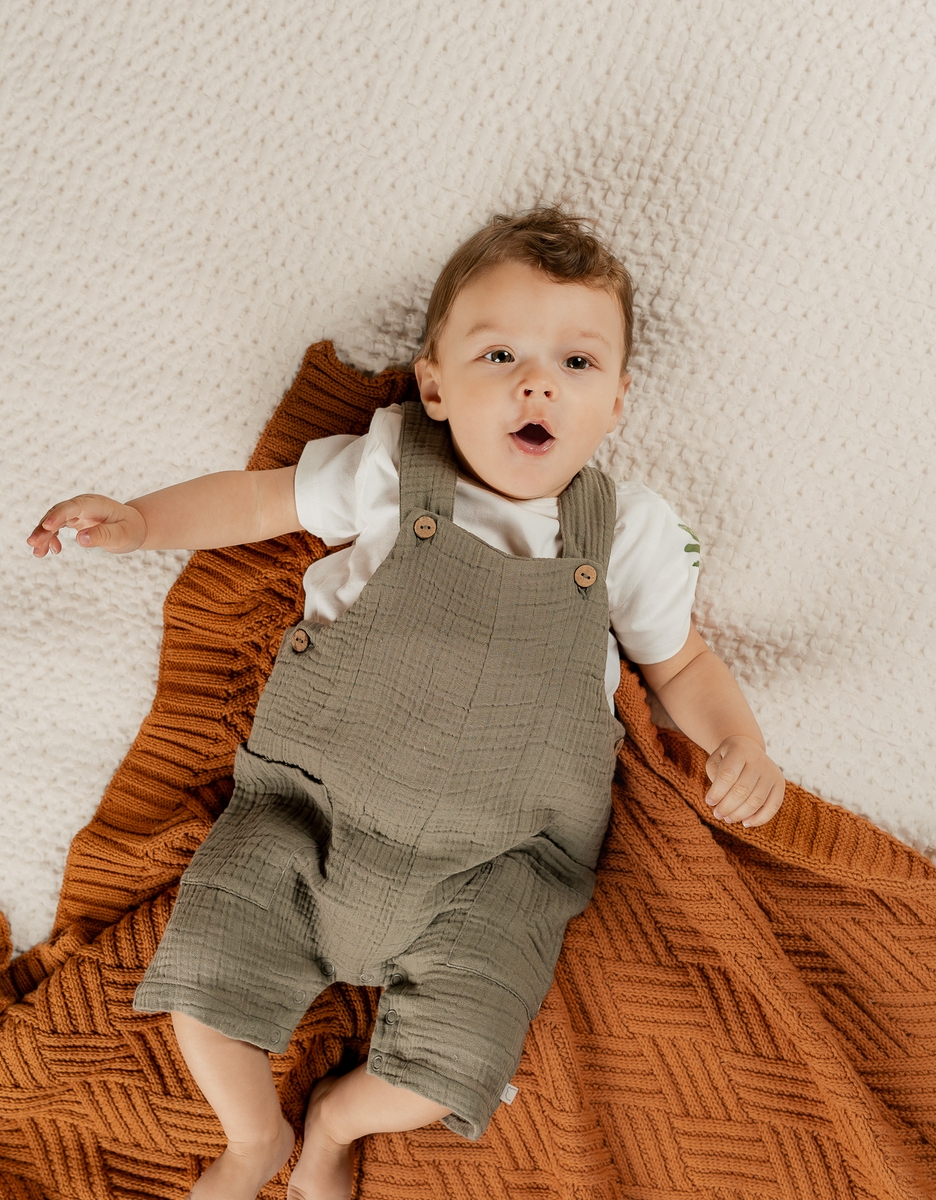 Deze verstelbare overall van khaki katoenen mousseline, verfraaid met mooie knopen van kokosnoot en voorzien van NKS-borduursel op de zak, wordt gecombineerd met een bijpassend T-shirt. Een prachtige outfit voor de uitjes van de baby!